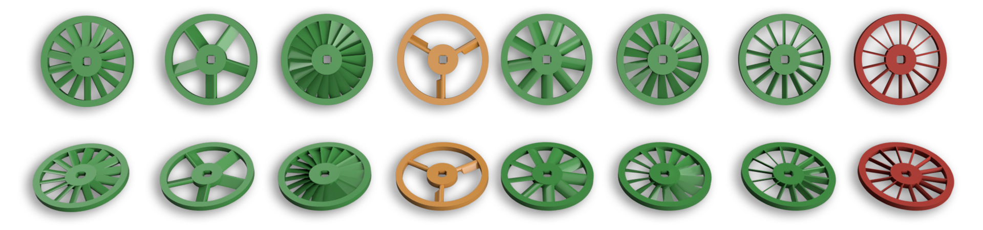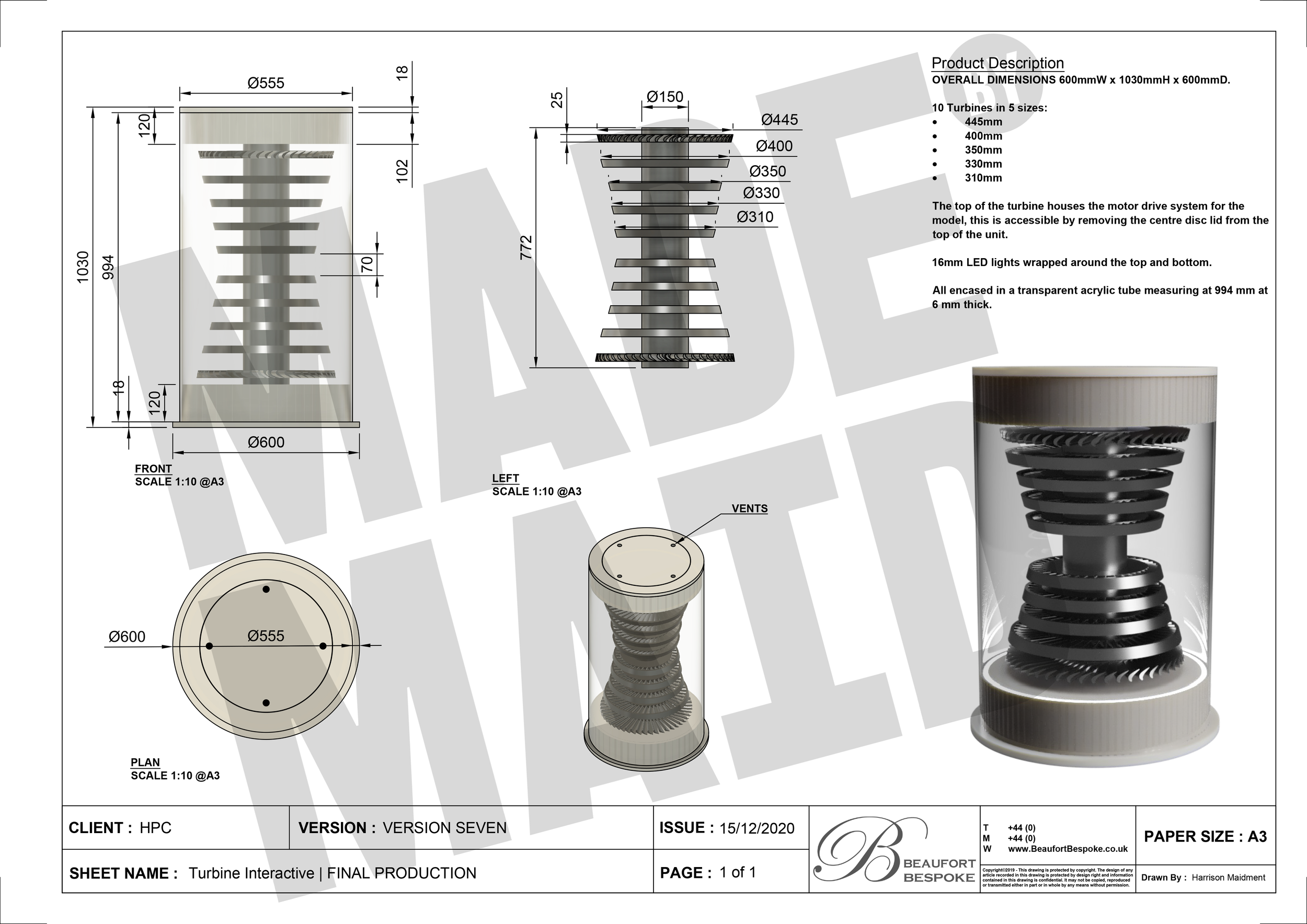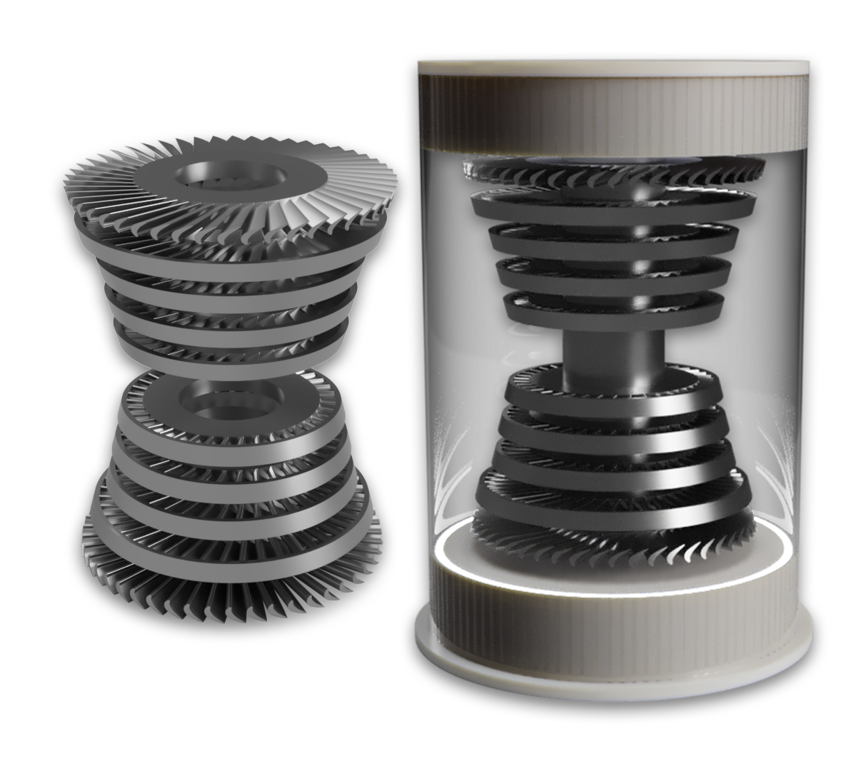 Each turbine wheel was 3D printed and finished in a durable brush metallic paint.
