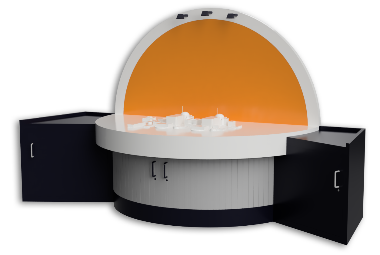 Controlled via the free standing table with projector canopy above similar to the Cityscape model. Interacting with the table top ‘touchscreen’ allows visitors to interact with the projectors.