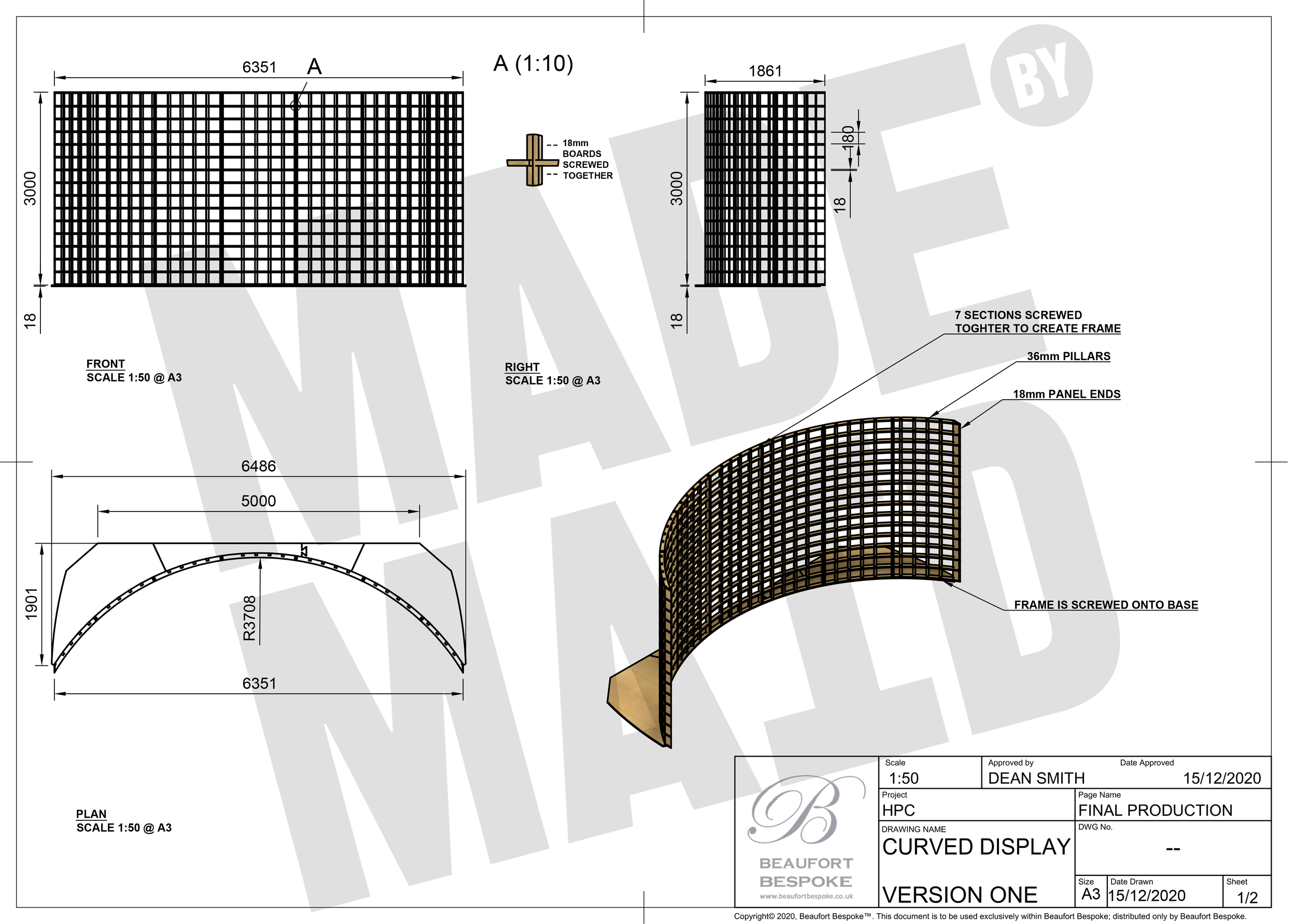 The curved projector screen is a pretty self explanatory element. Made of a timber framework and clad with thin matte white boards to give a non reflective surface for the projectors images.