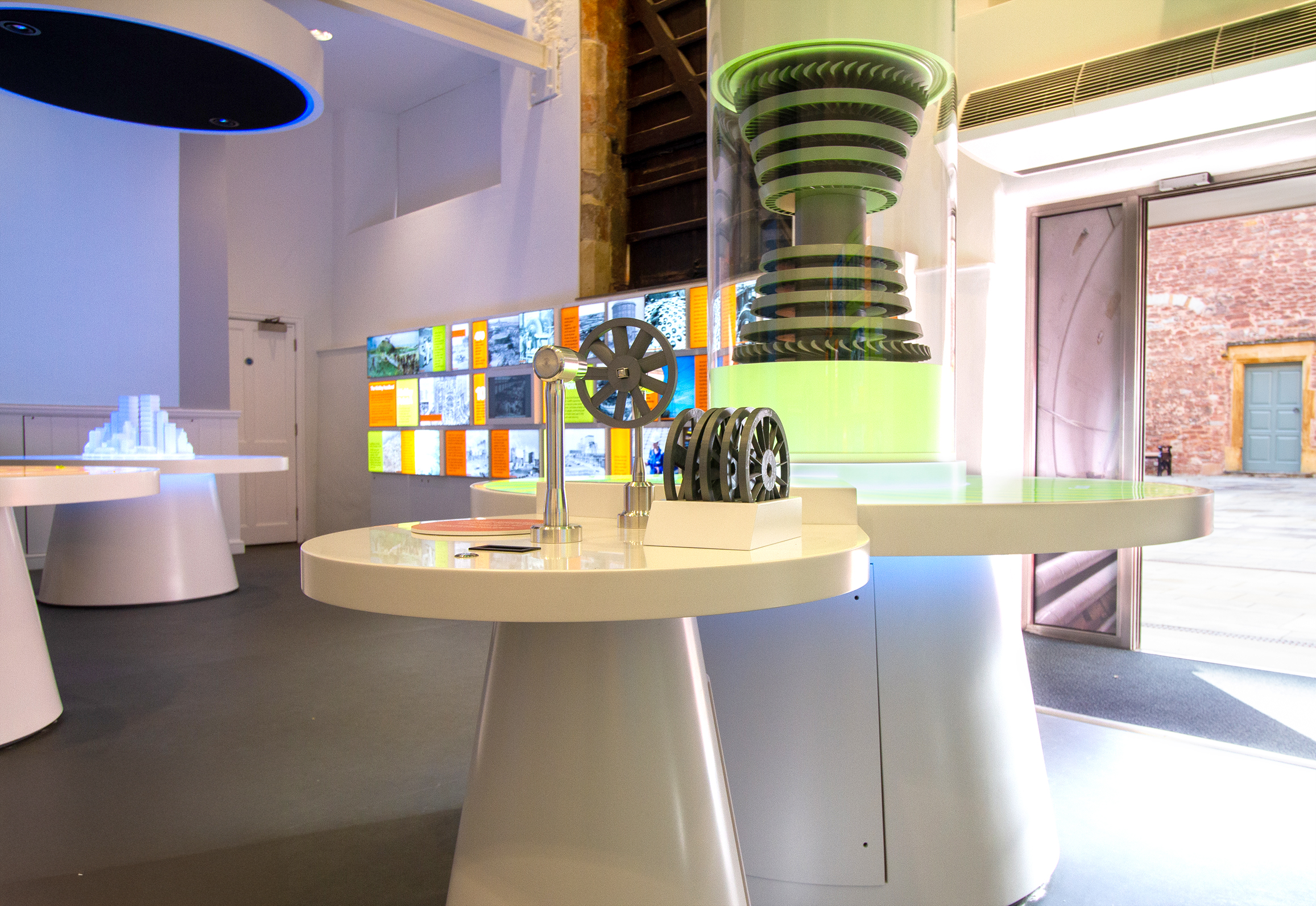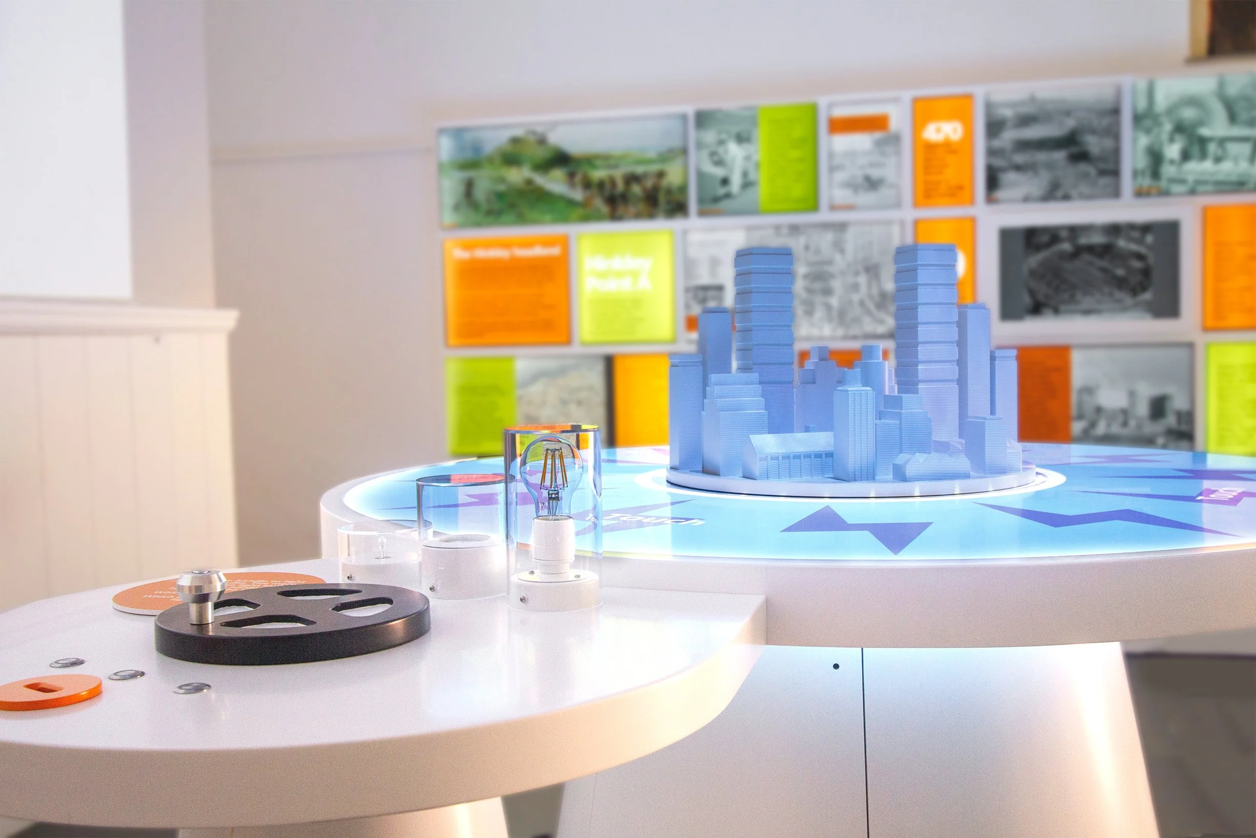 Featuring an overhead projector that turned the table top into a touchscreen, this model would show infographics stating how long HPC could power a city for and the amount of pollution that it would output as a result. Depending on what was clicked it would also impact the colour of the models projection.