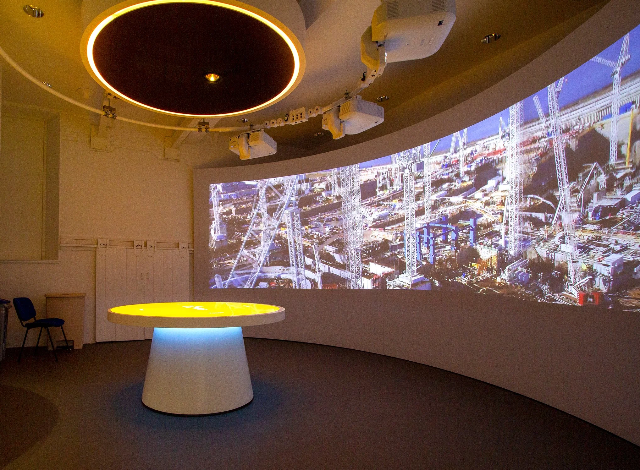 Featuring under lighting and low reflective finishes to allow clear projection images from the overhead canopies.