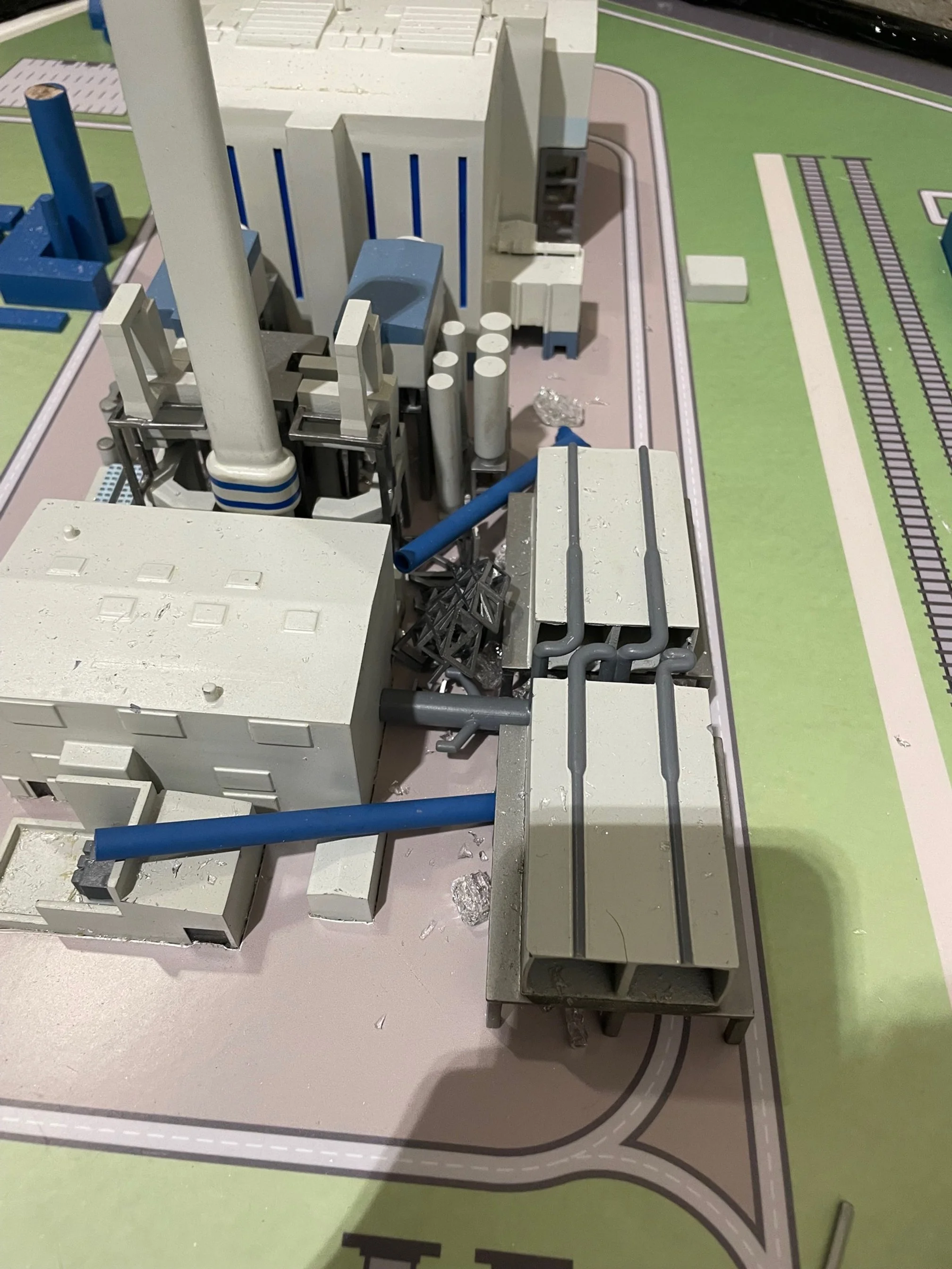This model was a 1500x1000mm model consisting of two Ferrybridge facilities and their operations. Also included in this model was a railway with cargo trains, power storage facilities, garbage disposal area and roadways with 18 wheeler trucks.