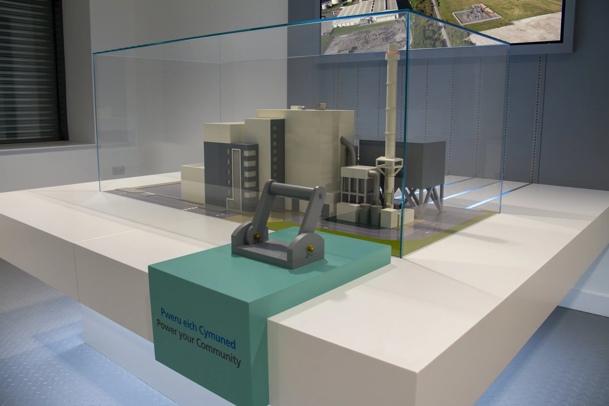 The main attraction of the interactives room was the model village, complete with the Parc Adfer facility. Located in the centre of the room in a free-standing cabinet, this model showcased the plant’s capability to fuel residential homes. Illuminating markers protruded from the model and were controlled via NFC tags that could be placed on the touchscreens. This created a physical, interactive learning experience demonstrating how this renewable energy source functions and how recycling plays a key role in making it possible.