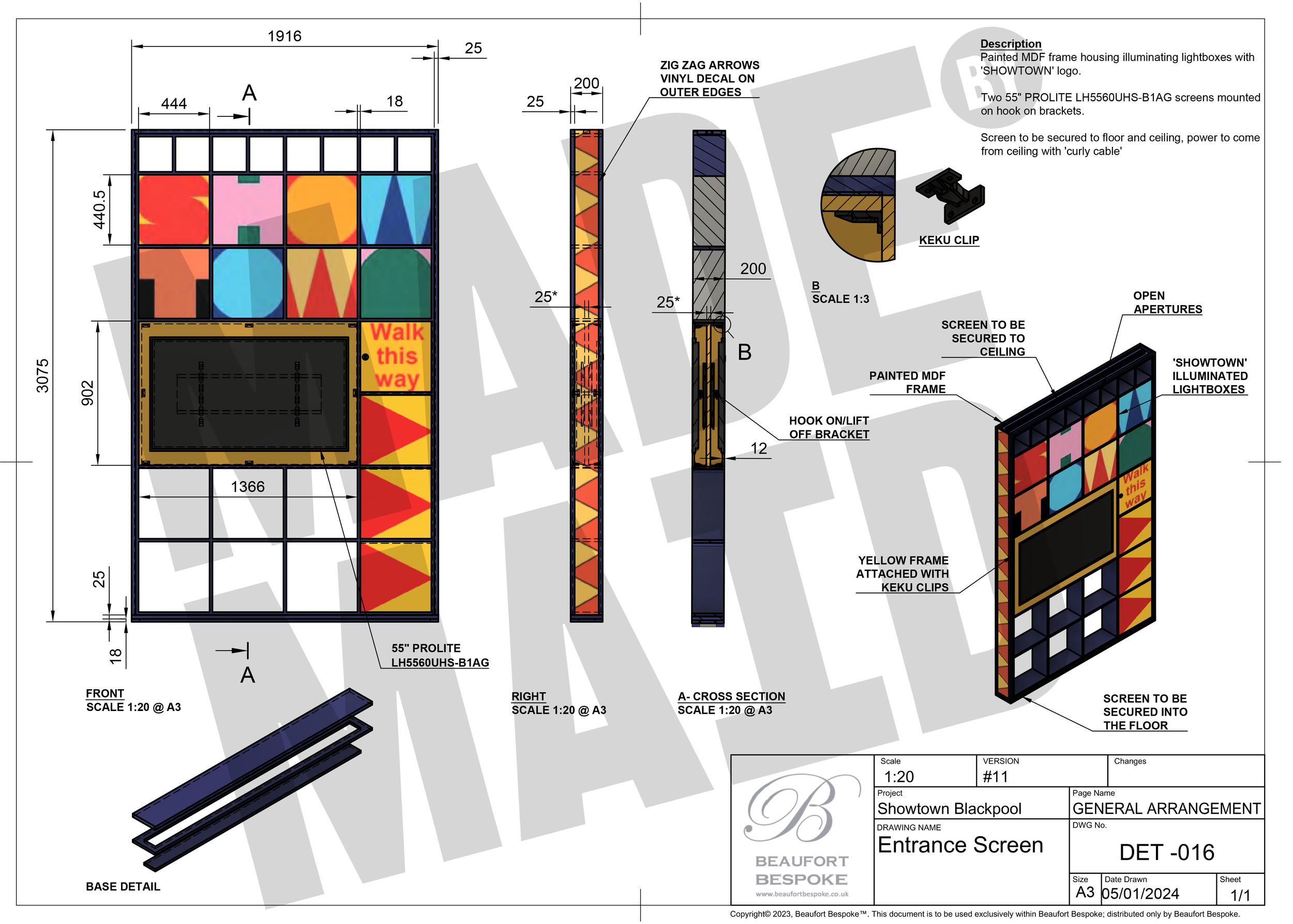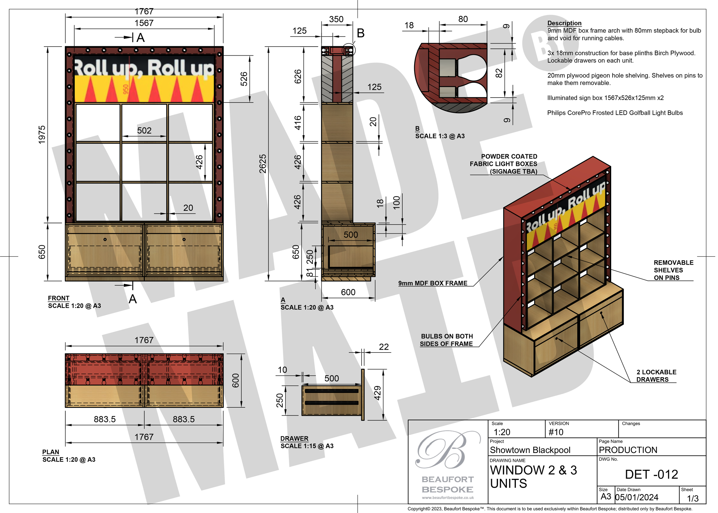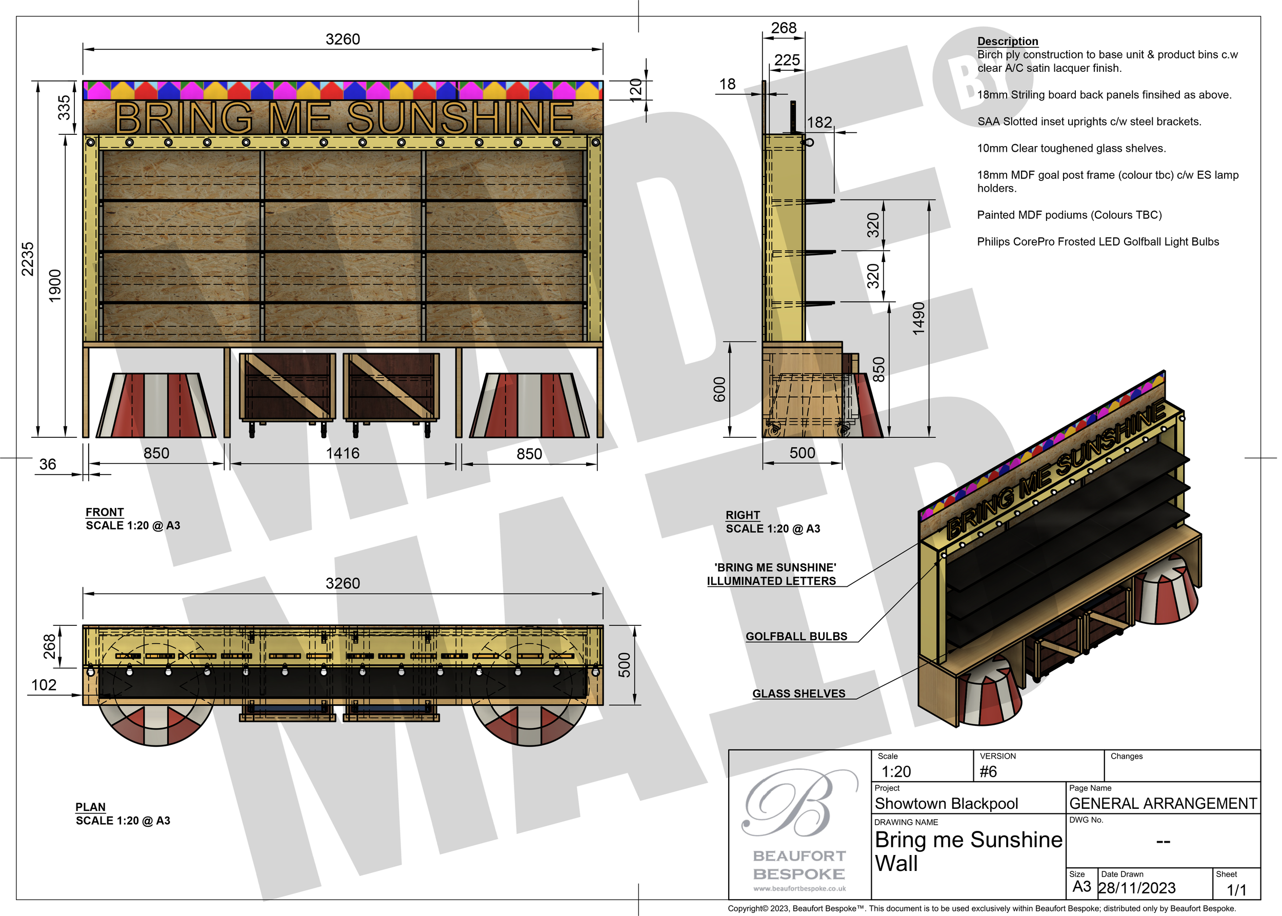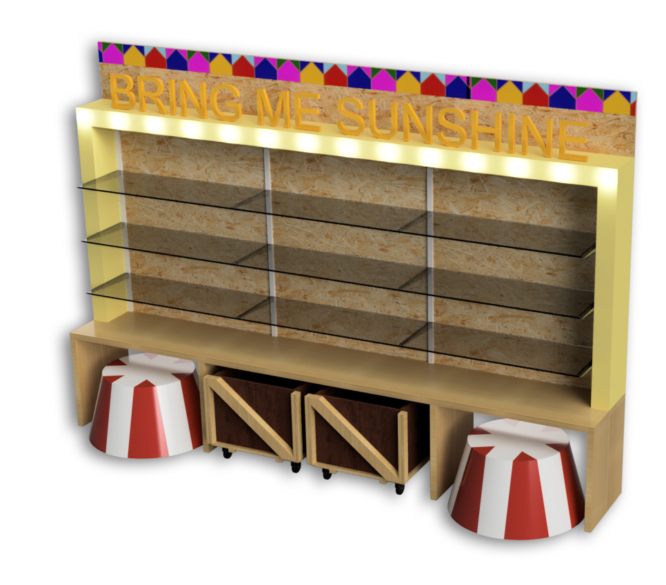 I predominantly worked on just a few fixtures on this project, including; a model carnival cannon, the Bring Me Sunshine Wall and the window Roll Up retail unit. Each being unique circus themed elements.