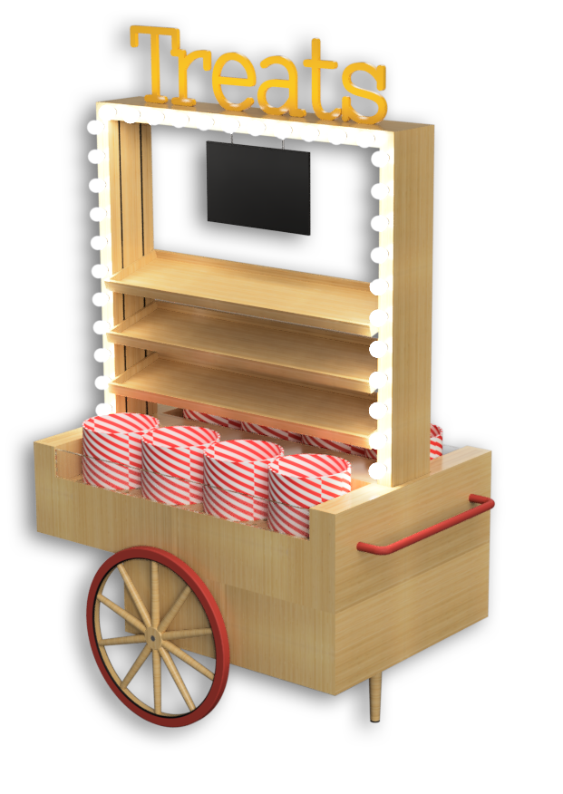 A mobile two sided cart that could hold both sweet treats and plush toys and games. This cart much like other elements had onboard LEDs so power had to be routed up into the ceiling to avoid tripping hazards. Fitted with large bicycle wheels either side and a retractable and lockable ‘stationary’ leg to ensure its stability.